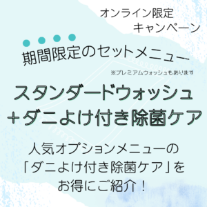 基本メニューと人気オプションメニューの【ダニよけ付き除菌ケア】をセットにしたお得なメニューを期間限定でご用意いたしました。
